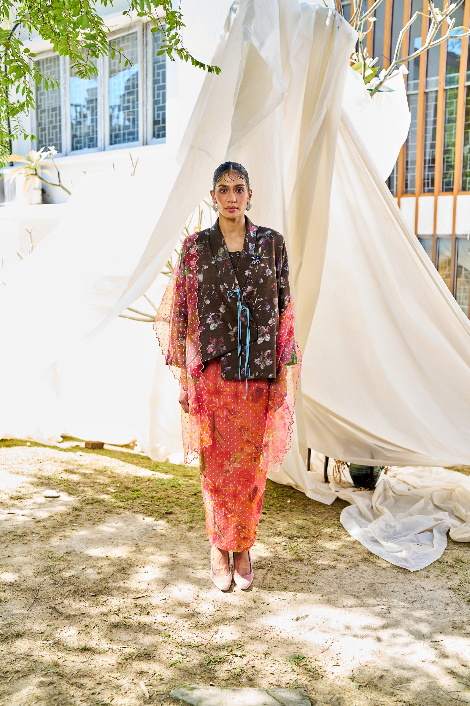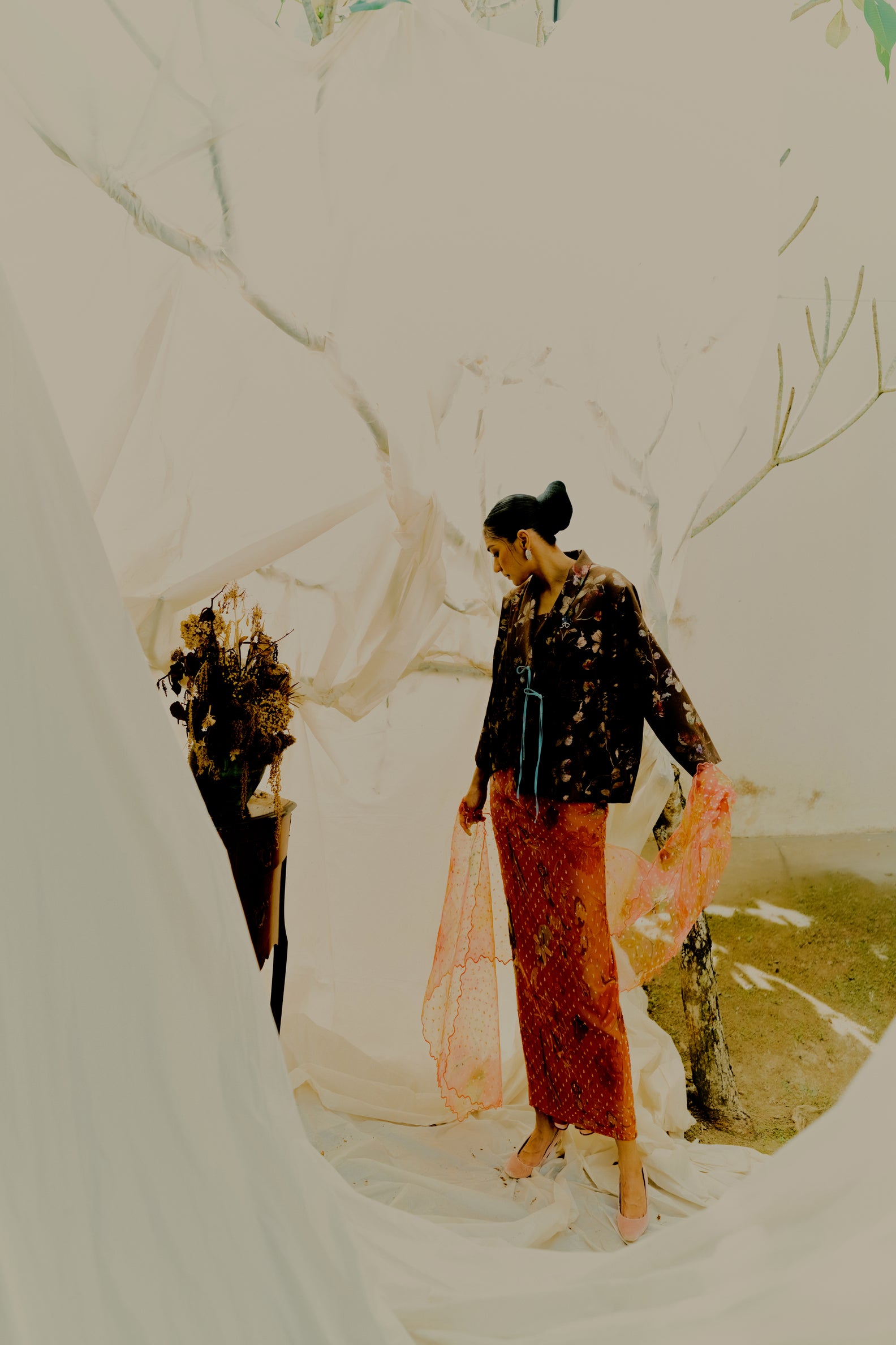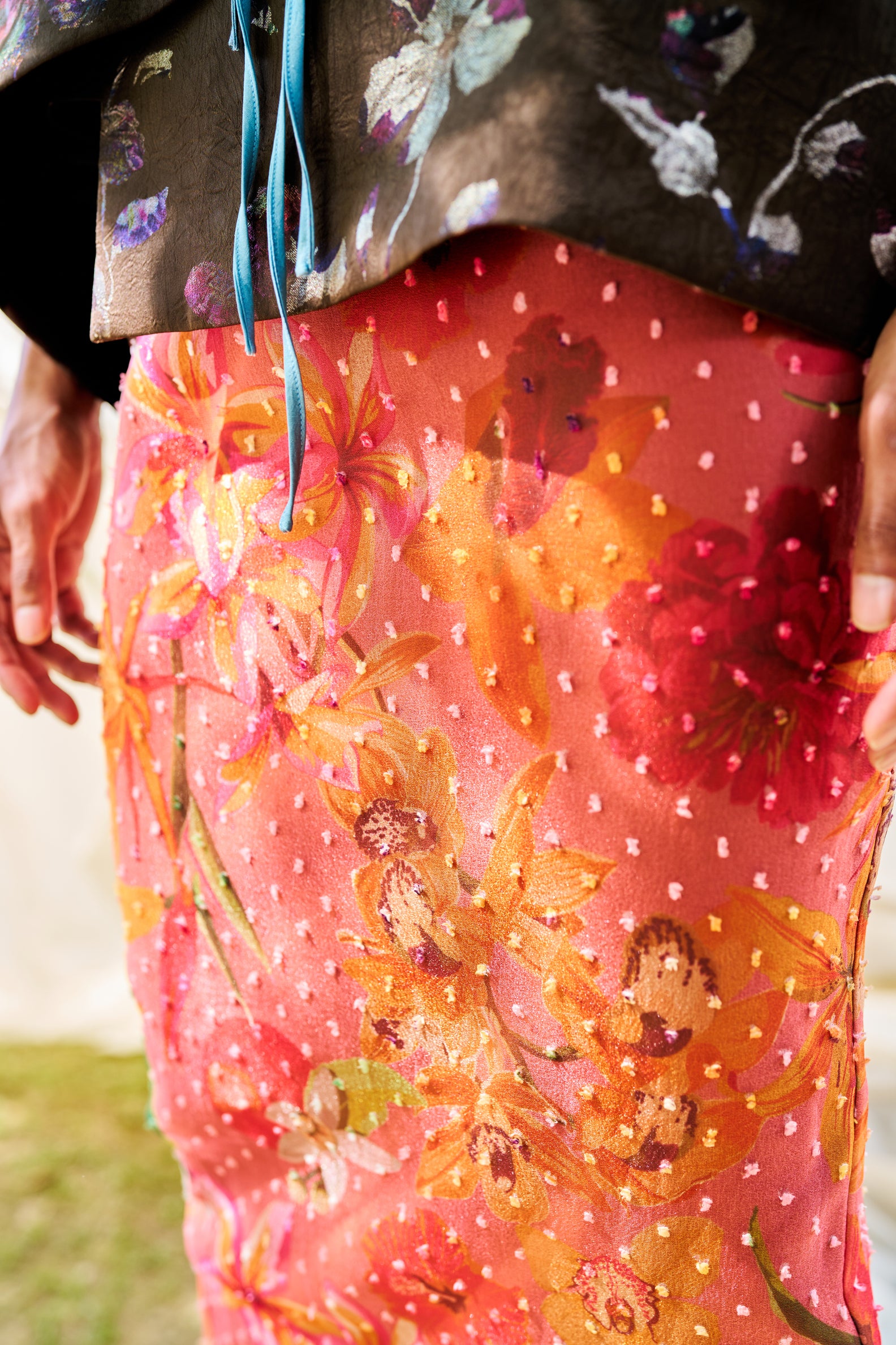 - Soft organza with a floral gradient in an orange-red blend as the main tone.