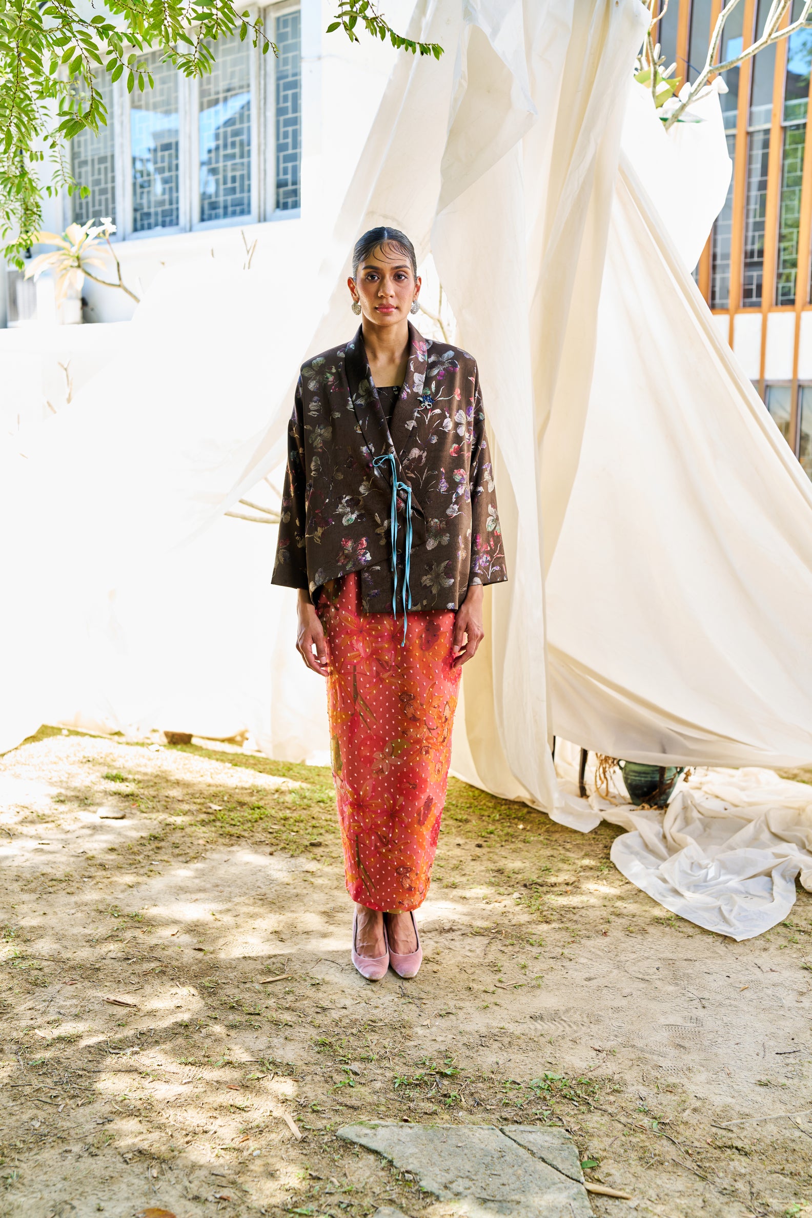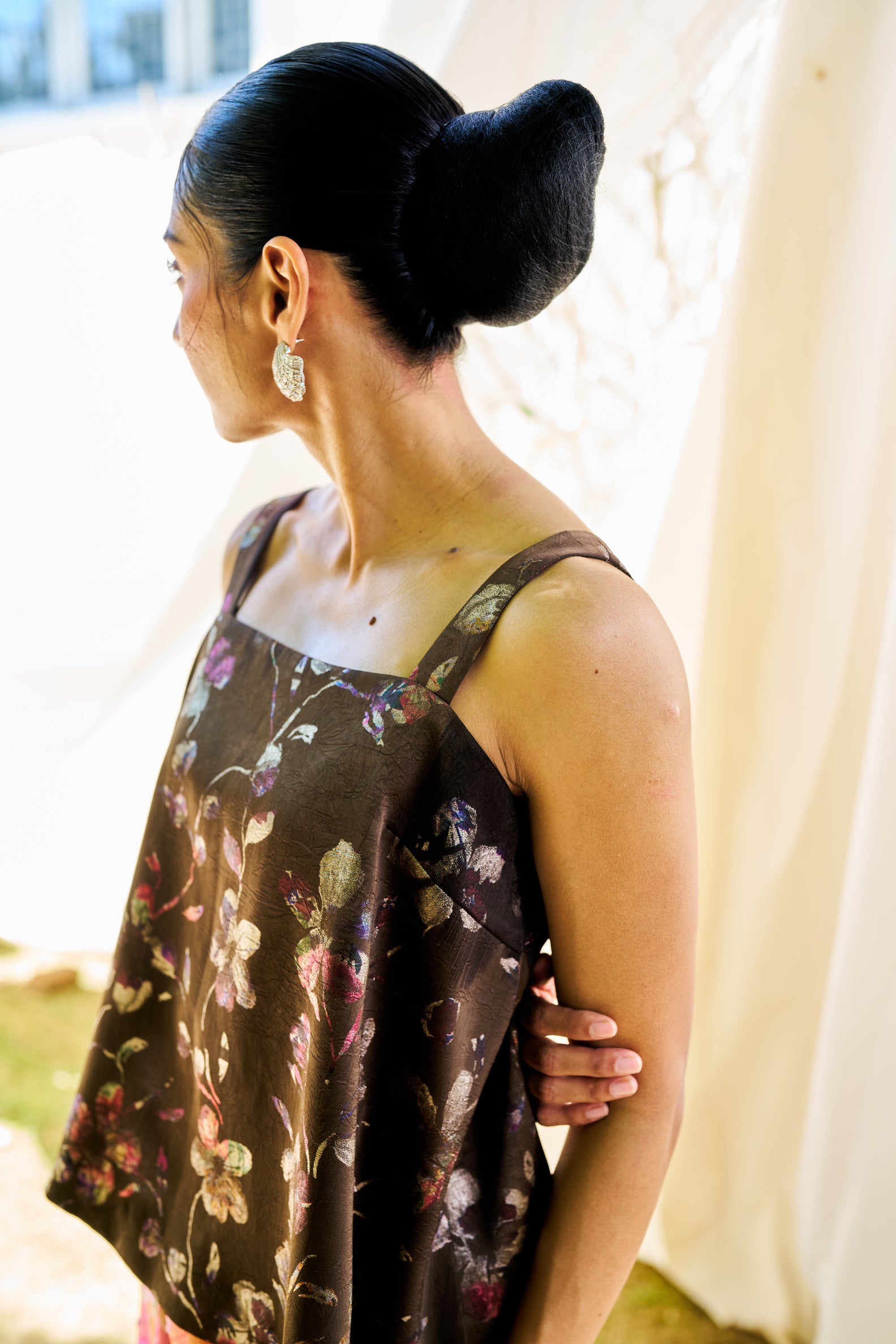 Dark florals ground the form. Structured and composed.