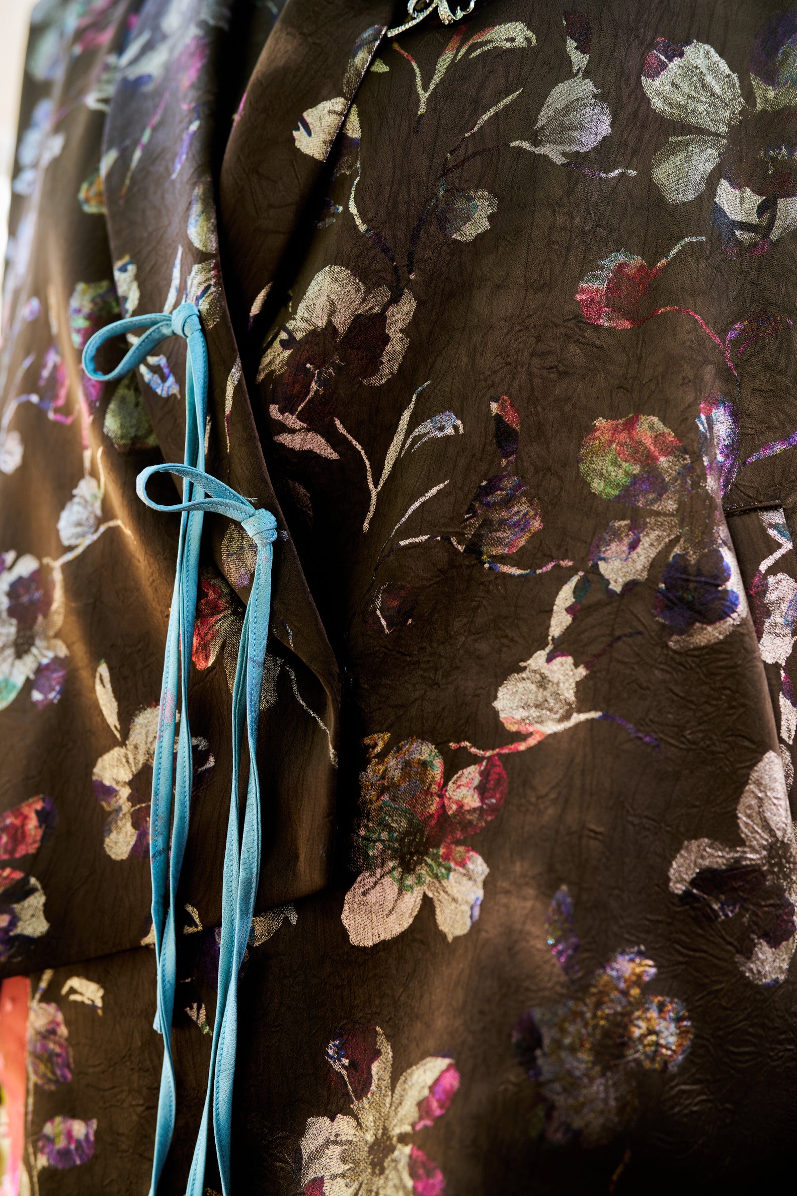 - Espresso base with gradient multicoloured floral embroidery detailing.