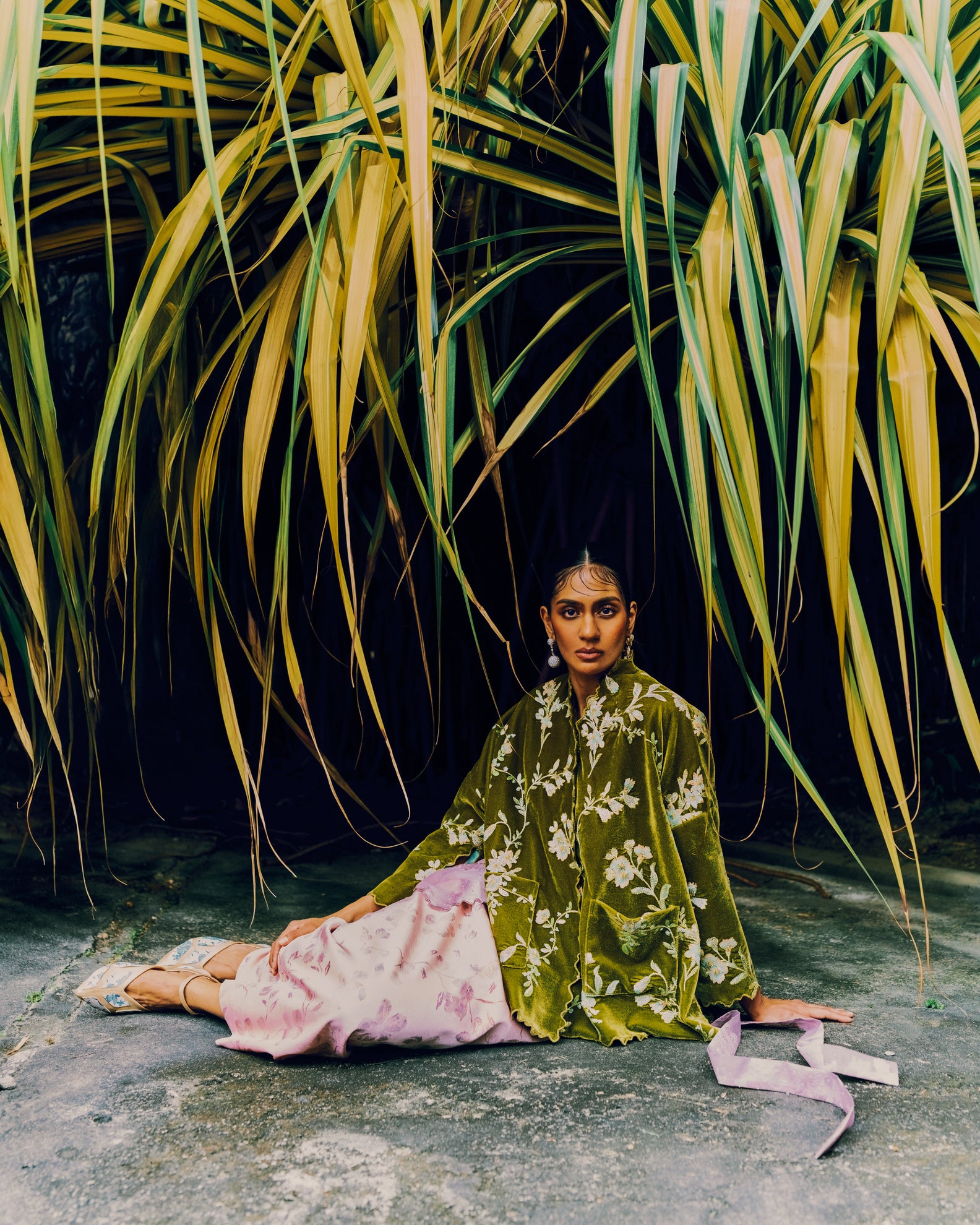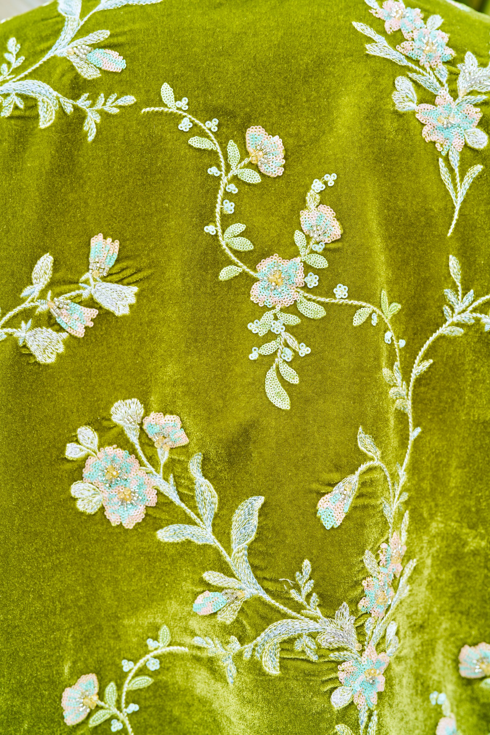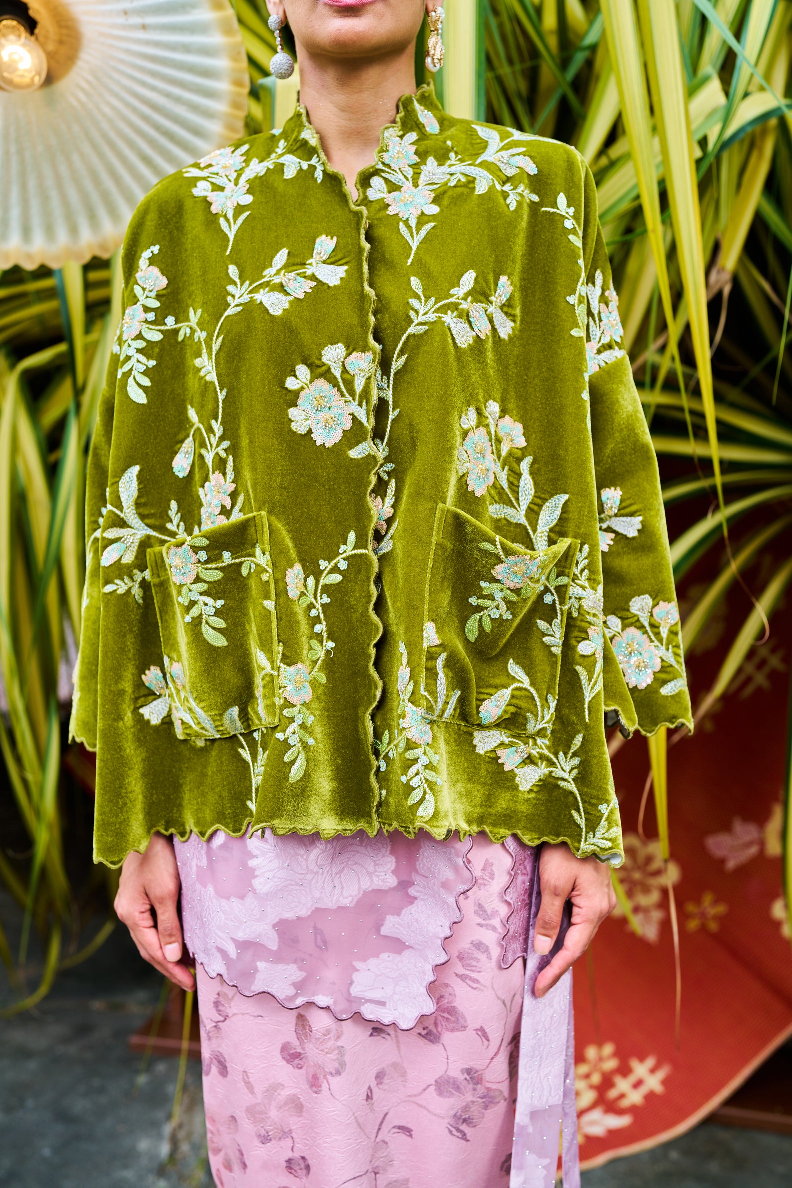 An embroidered velvet outer, botanical and grounded.