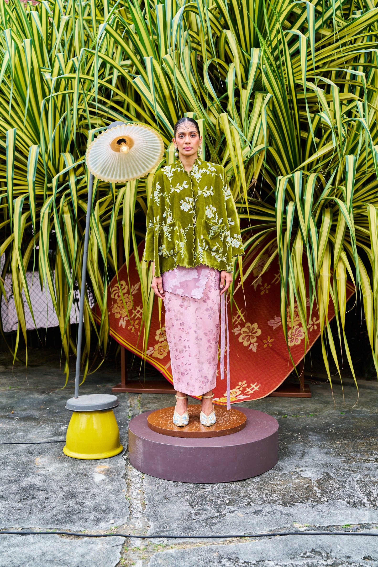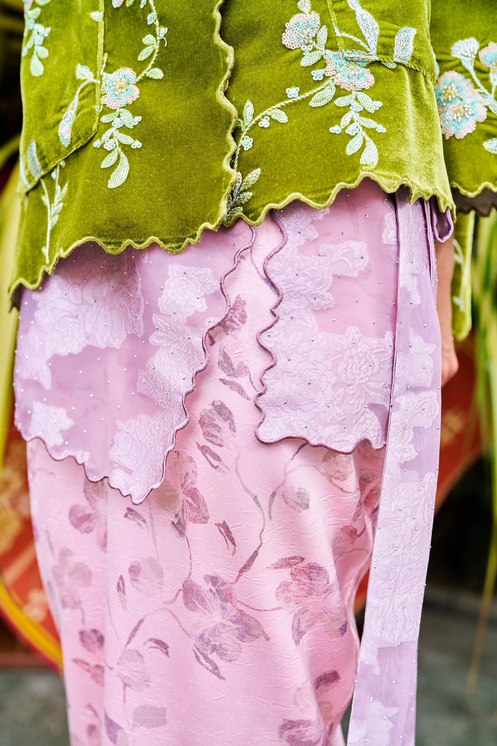 Beneath it, a mauve lady sampin in thick organza: translucent, structured, deliberate.