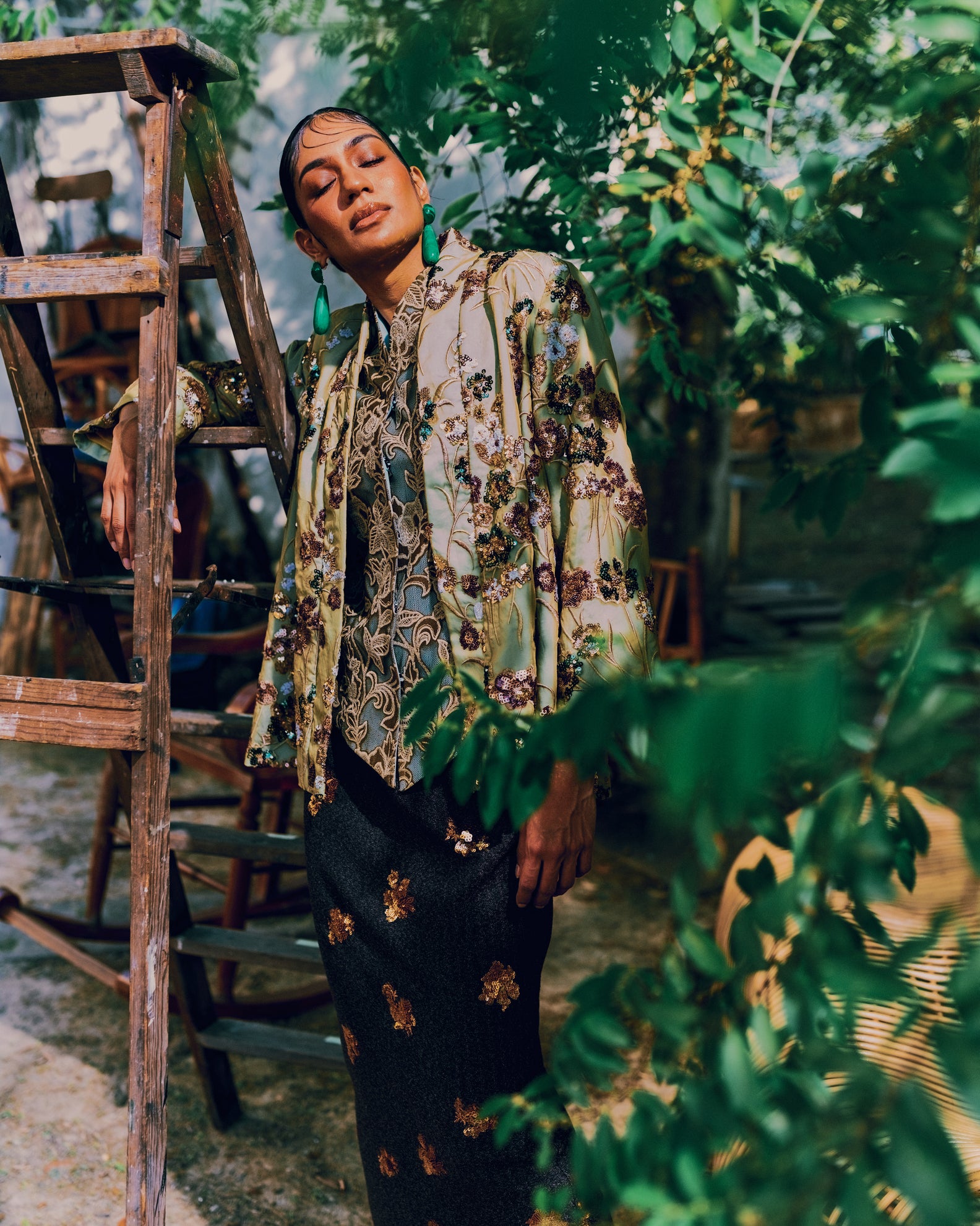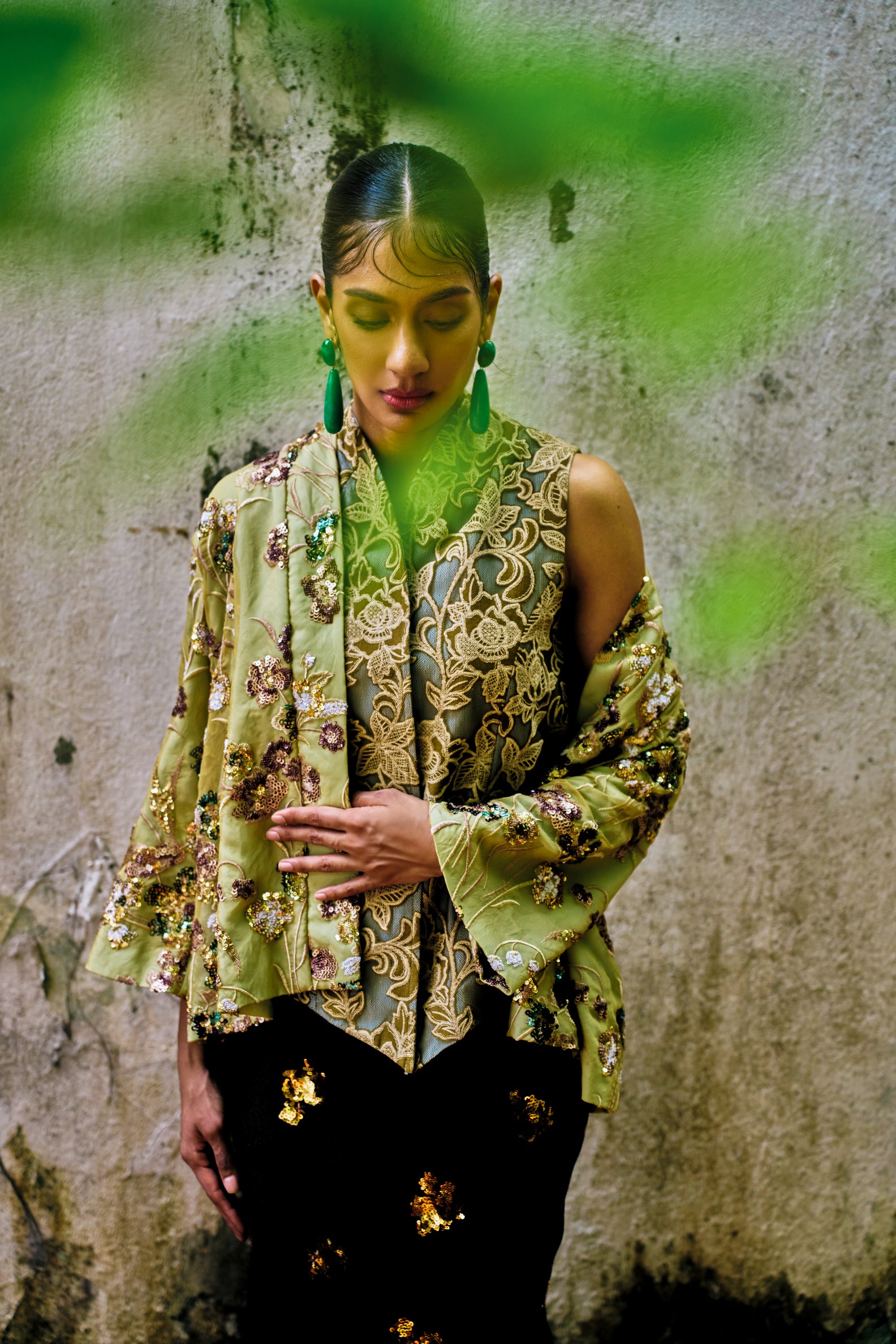 The outer layer : a kimono soft jacket feel in muted mustard, almost burnished gold, rests lightly on the shoulders. Its surface is adorned with delicate gold stone detailing, catching light like antique jewellery passed down through generations.
