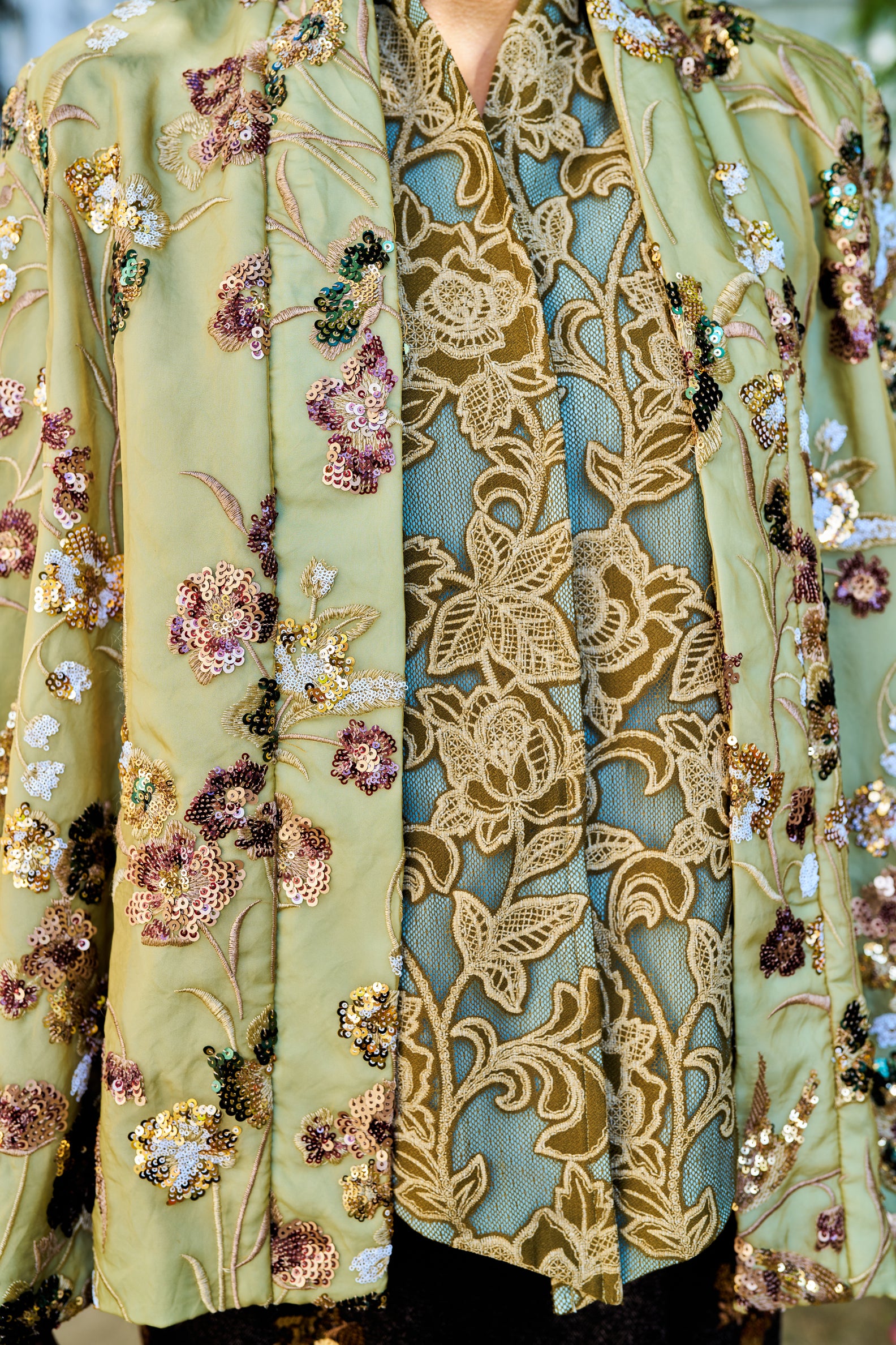 - Intricate floral embroidery enhanced with deep gold, emerald green, and off-white sequins.