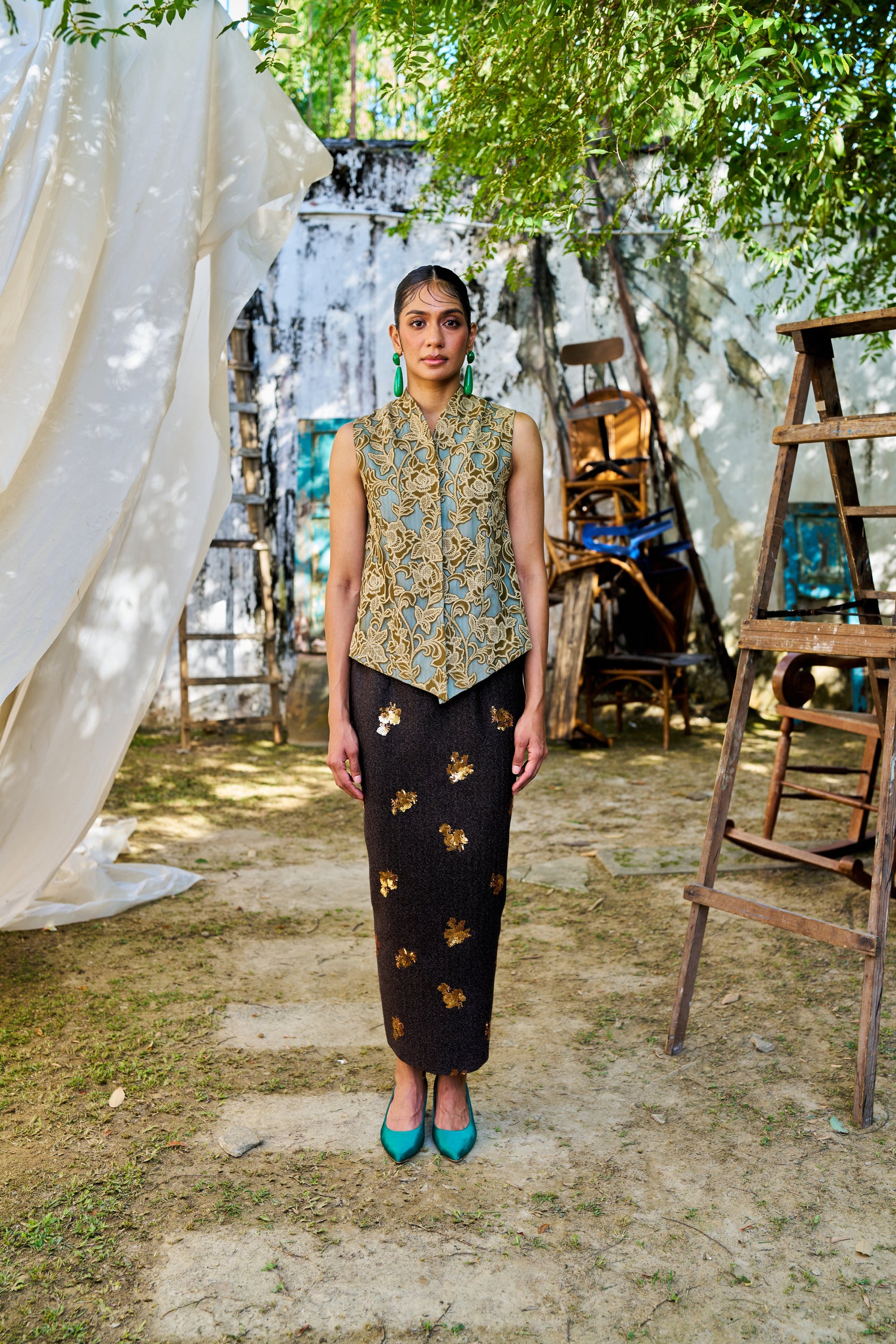 The ankle length tapered skirt anchors the silhouette in a deep, dark brown base, rich and grounded. Gold detailing is scattered across it, not to sparkle loudly, but to glow quietly against the earth-toned base.