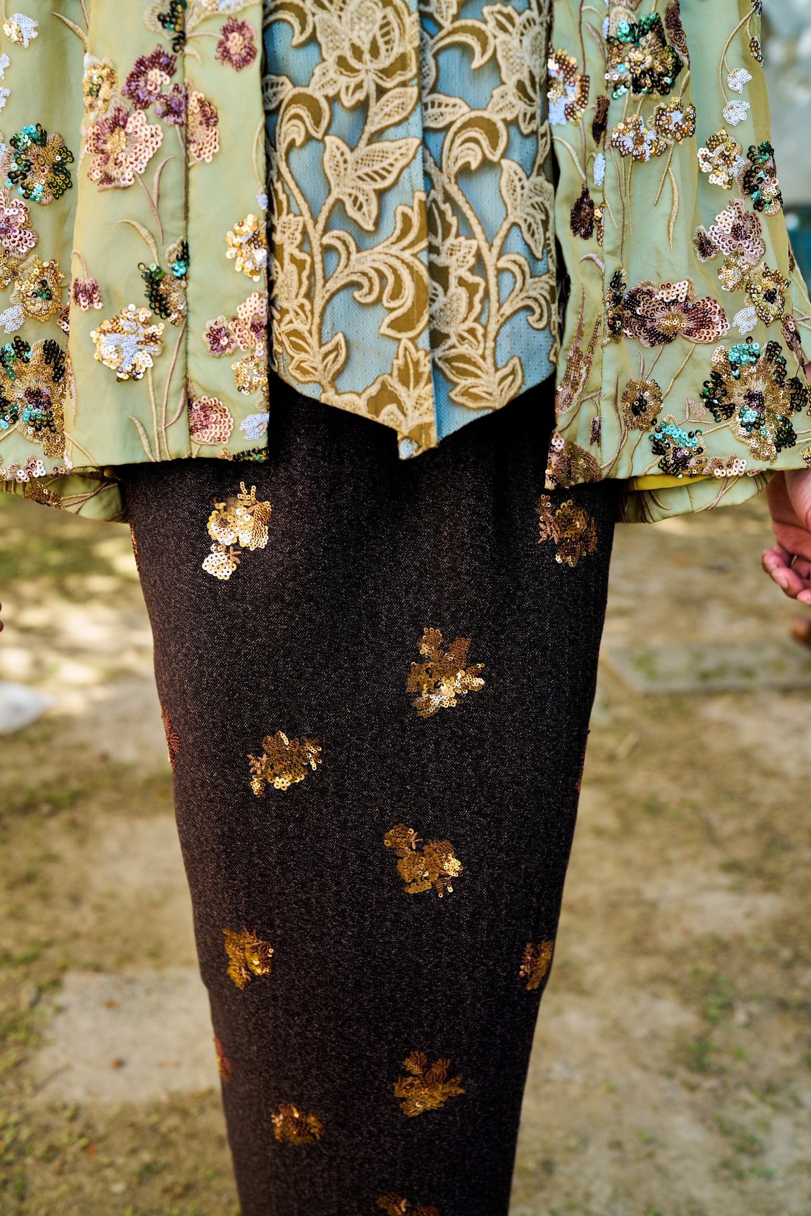 Beneath it, a sleeveless cheongsam inspired inner in sage/olive tones contours the body with clean precision. The neckline is structured. The cut is deliberate. It sharpens the softness of the jacket, creating tension between fluid drape and architectural line.